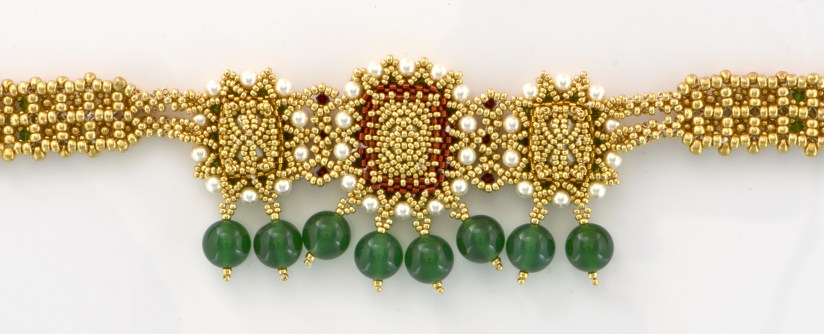 Timaniya means three (tin) gems (maniya). Timaniya necklace is a neck hugging necklace like a chokar necklace. Typically, it has three central pieces holding three precious gems, attached with multi-strand glass beads on sides.